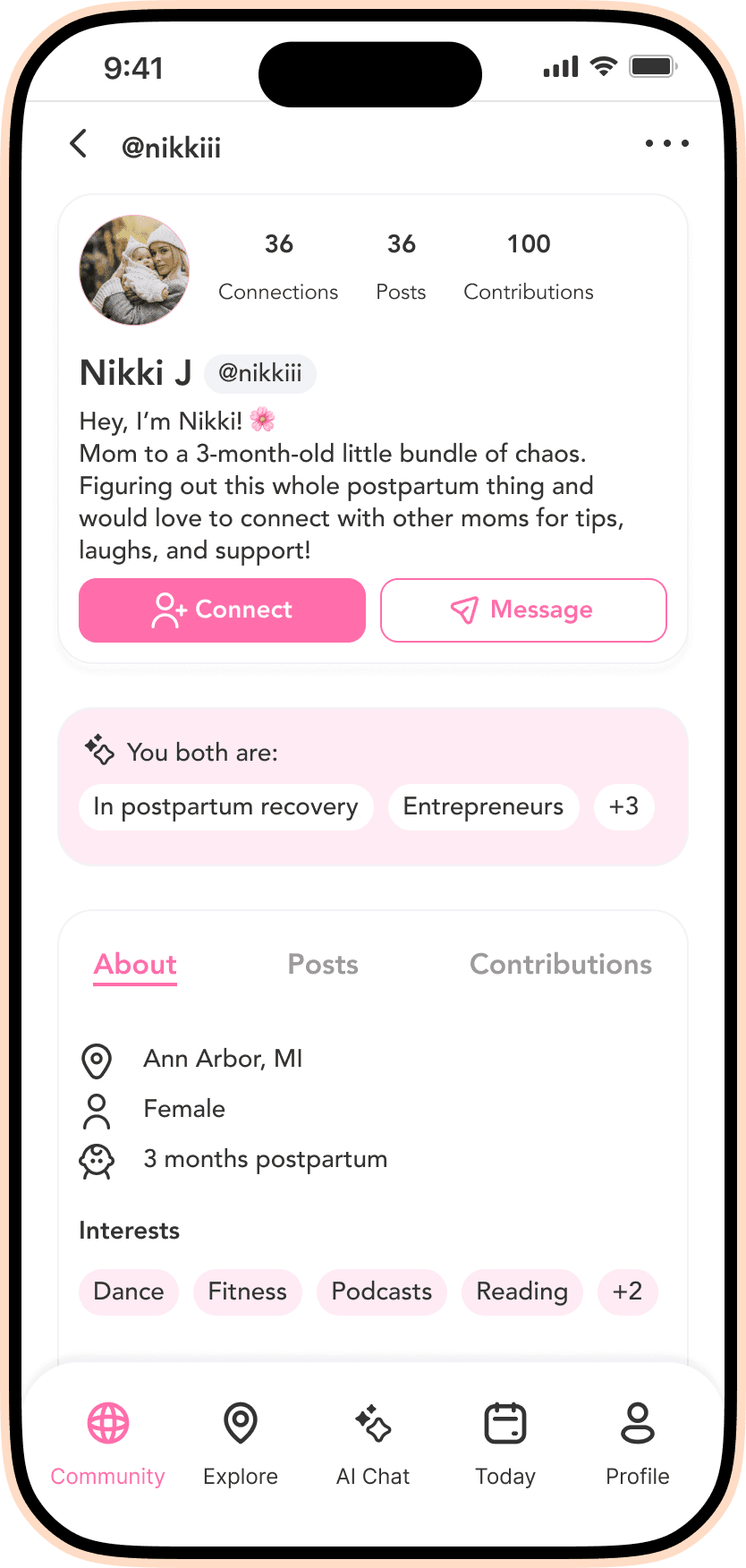 AI highlights commonalities on profiles and offers prompts to foster deeper 1:1 connections and better understanding between moms.
