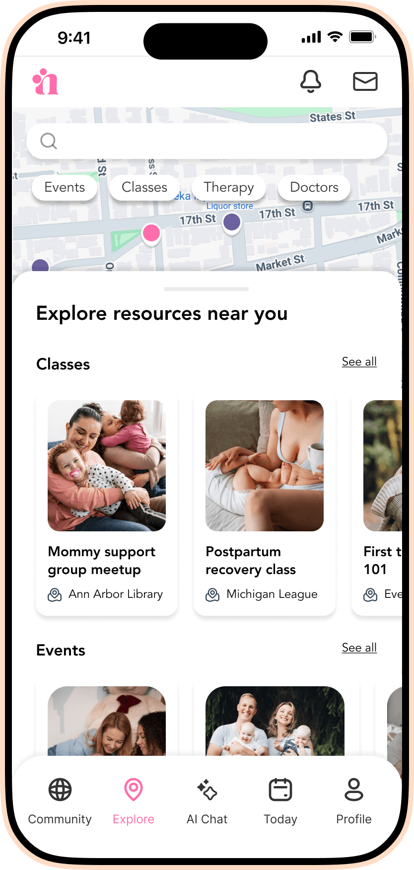 Discover moms through categories like “Near Me” or shared experiences for meaningful connections.